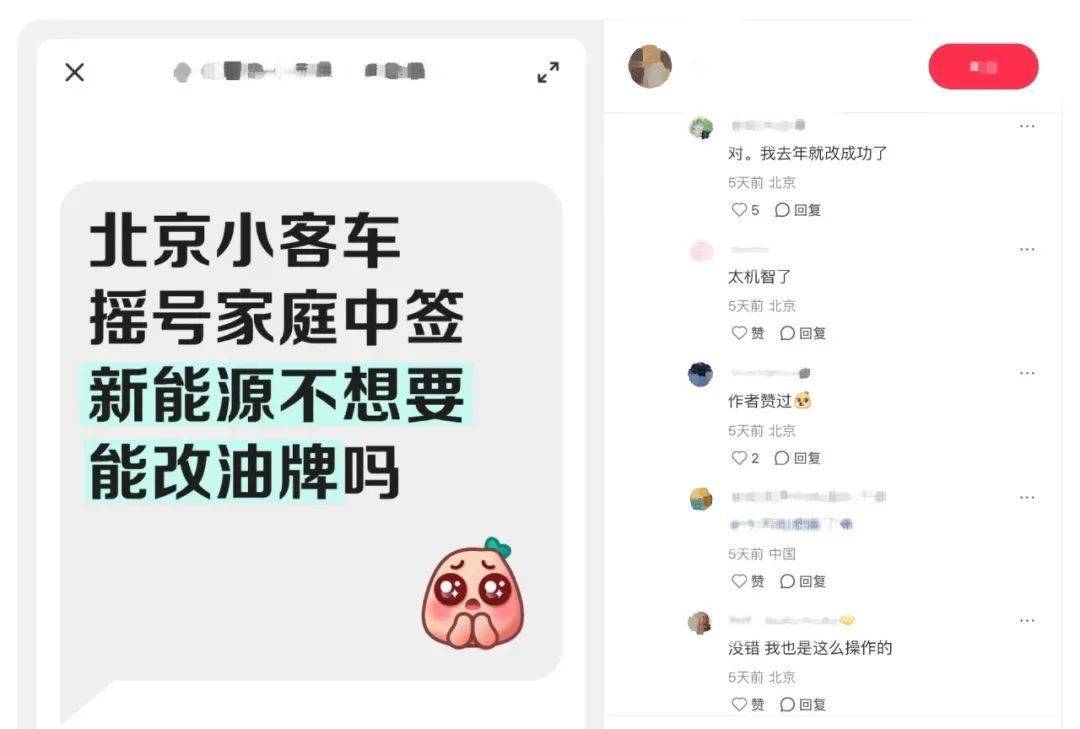 有网友留言表示,新能源车指标在获得后可以放在手里“等1年”,然后就可以申请“电标换油标”。 网络截图5月26日上午,北京配置2025年新能源小客车指标,其中,家庭新能源小客车指标额度为118400个,个人新能源小客车指标额度为14600个,单位新能源小客车指标额度为4000个。由于今年家庭新能源车指标额外增加了6万个,家庭新能源指标入围分数线也骤降至42分,比去年的60分低了18分,同时更是创下北京实行小客车指标新政以来的家庭新能源指标入围“分数线”历史最低。门槛的降低也让一些原本处在观望状态的无车家庭申请者突然“意外”中签,对于部分申请者而言,相比已经“到手”的新能源车指标,他们更青睐传统燃油车。“本来以为自己这次没机会的,但没想到分数线降了这么多,我们一下就中签了。”市民小王选择的是家庭新能源指标和家庭普通燃油小客车指标共同配置的方案,按照他自己预估的分数,今年5月的这次新能源指标配置中签的概率不大,而且综合日常使用场景和充电便利程度,他更希望能获得燃油车的指标,因而他将关注的重心放在了今年6月和12月的两次普通燃油车的摇号配置上。近日,小王和一些网友发现,网络上突然出现一种说法称:在家庭新能源指标中签后,如果不去处理,只需要经过一年时间,就可以申请将电车指标更换为油车指标,还不用再次摇号。