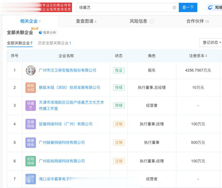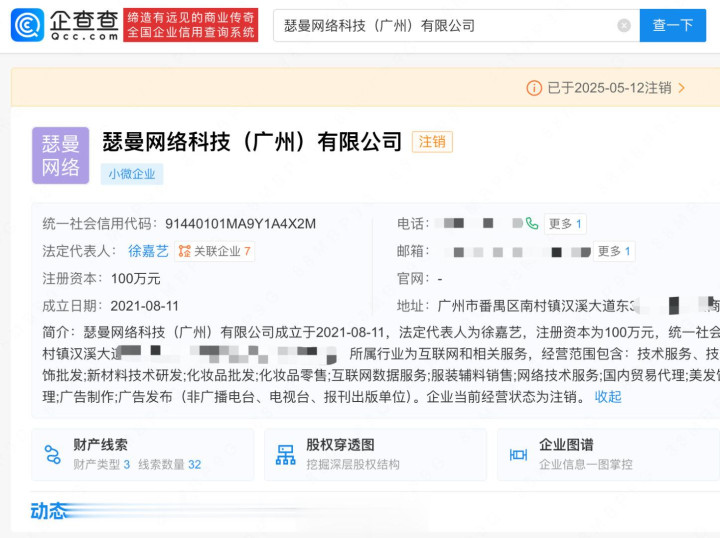 [#网红猫一杯关联公司注销#]#猫一杯被起诉后注销名下公司#企查查APP显示,近日,瑟曼网络科技(广州)有限公司经营状态从“在业”变更为“注销”。该公司成立于2021年8月,注册资本100万股票低息配资,由徐嘉艺(猫一杯)担任法定代表人并全资持股。当前,徐嘉艺名下关联7家公司,3家为存续状态。